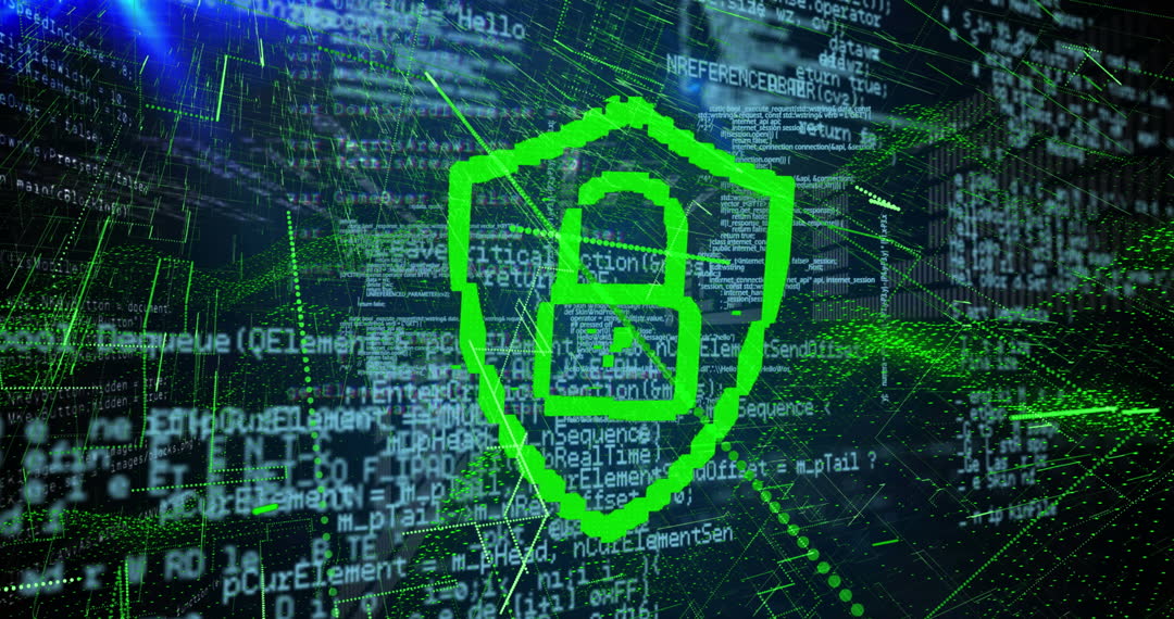 Animation depicting a green digital padlock surrounded by coding elements signifies securing information within a virtual network. Ideal for illustrating topics related to data security, information encryption, online safety, and technology advancements in cybersecurity. Useful for tech-related media, cybersecurity articles, or informational content on digital protection techniques.