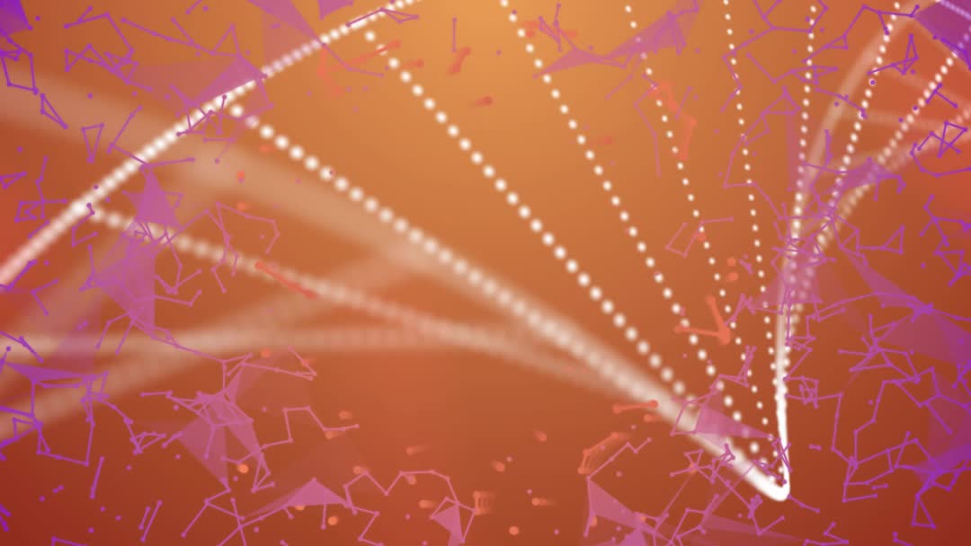 Dynamic portrayal of digital particles and network visuals on an orange gradient background. The scene features vibrant arcs and beams in motion, showcasing themes of innovation and technological advancement. Perfect for use in promotional materials for tech companies, presentations on virtual innovations, or backgrounds for digital creative projects highlighting futuristic visions.