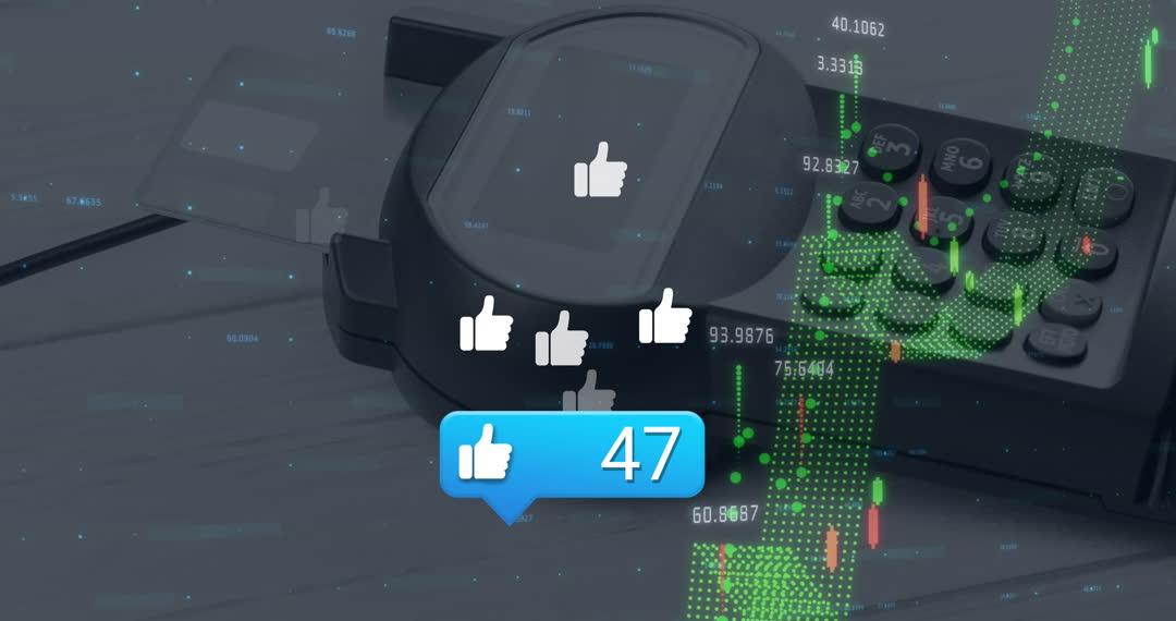 Combination of digital payment systems with interactive social media elements and financial data. Ideal for illustrating articles on mobile wallets, financial apps, the intersection of finance and social media, or discussions on modern digital transaction confidence and public engagement.