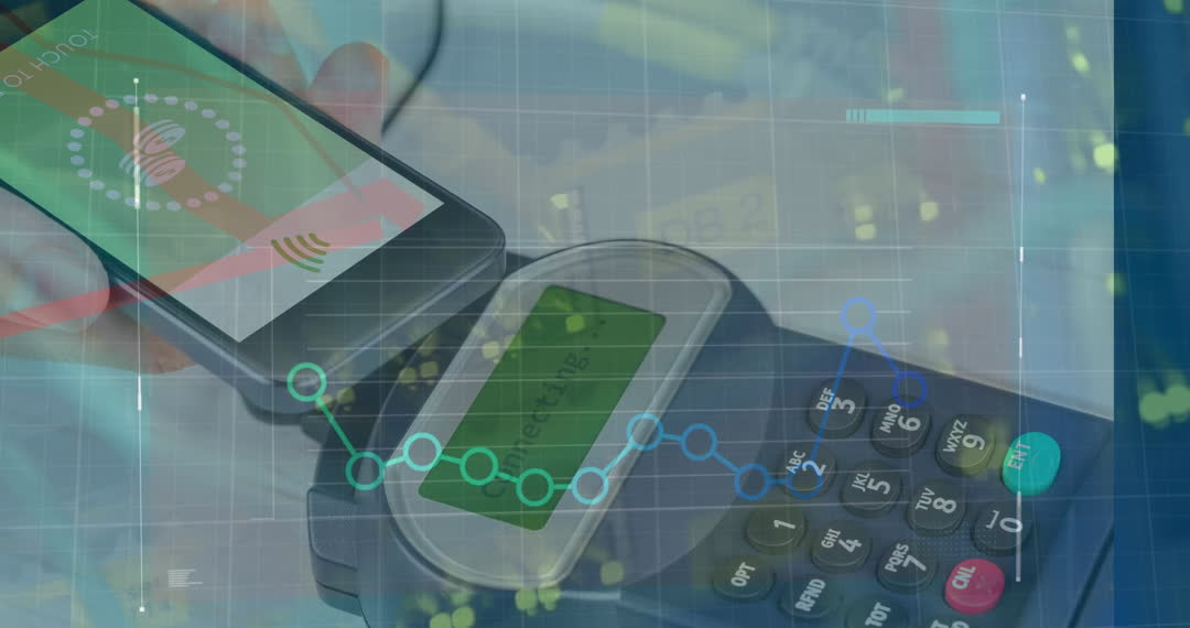Visual portrays integration of digital payments through a mobile device and traditional card terminal, overlaid with analytical graphs and data, highlighting the impact of technology in financial services. Suitable for illustrating topics on fintech, modern banking solutions, and digital transaction futures for educational and professional presentations. Can also be used for marketing materials focusing on technological innovation in finance or finance blogs discussing the rise of contactless payment methods.