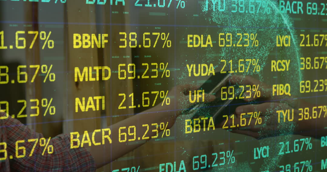 Combination of digital payment technology and stock market data showcases modern business trends. Useful for illustrating concepts in finance, digital currency, and economic development. This visual can be used in presentations, articles, and marketing related to financial services.