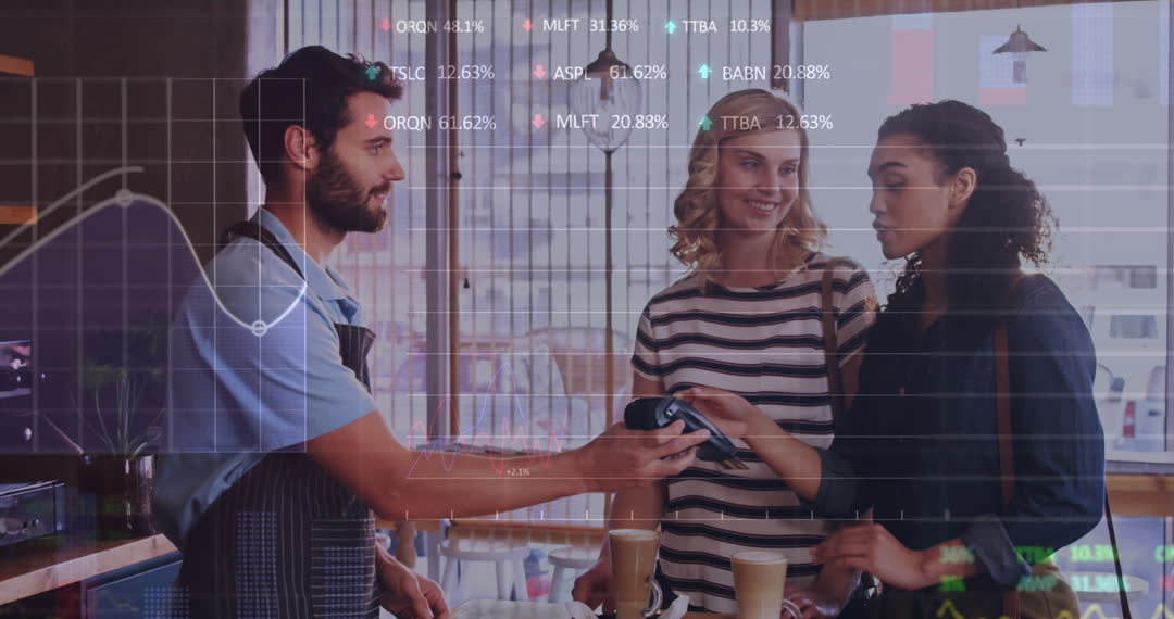 Caucasian male barista giving credit card reader to two customers at coffee counter, with stock market data overlay, demonstrating concepts of modern technology integration in everyday life. Ideal for illustrating themes of financial transactions, technology in business, and impact of market trends on daily activities. Suitable for use in articles discussing fintech, retail innovations, or economic trends.