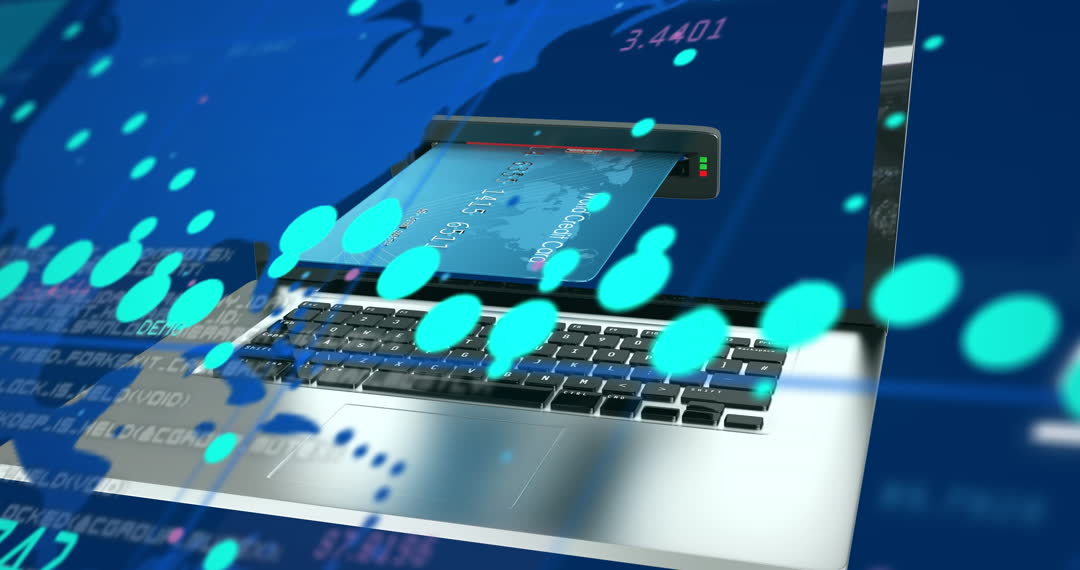 This visually engaging video displays futuristic digital payment processing with a prominently displayed credit card above a laptop keyboard. The dominant tech-infused theme enhances appeal to financial technology-oriented campaigns, online banking services, and advertisements targeting digital transactions and cybersecurity in global businesses.