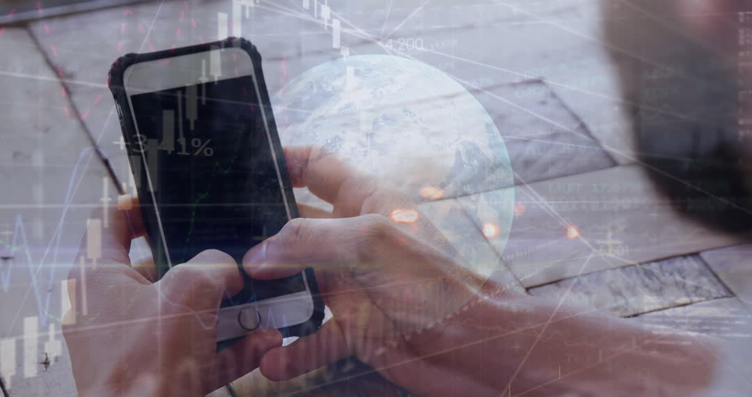 Illustrates concepts of digital transactions and global financial data. Ideal for articles on e-commerce trends, mobile banking innovations, or the integration of technology in financial sectors, this abstract visual represents progression in finance with a blend of human interaction and digital data.