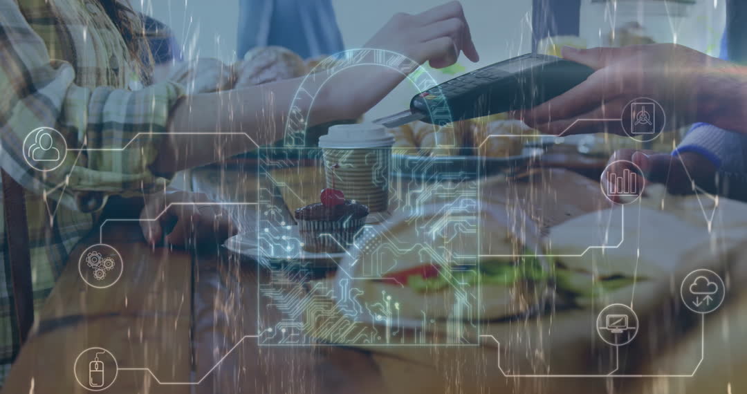 Compilation of digital payment at a cafe, featuring hands completing a transaction with a credit card reader. Overlay of futuristic data graphics highlights the cyber security involved in modern transactions. Use for illustrating finance, technology advancement, or digital security topics.