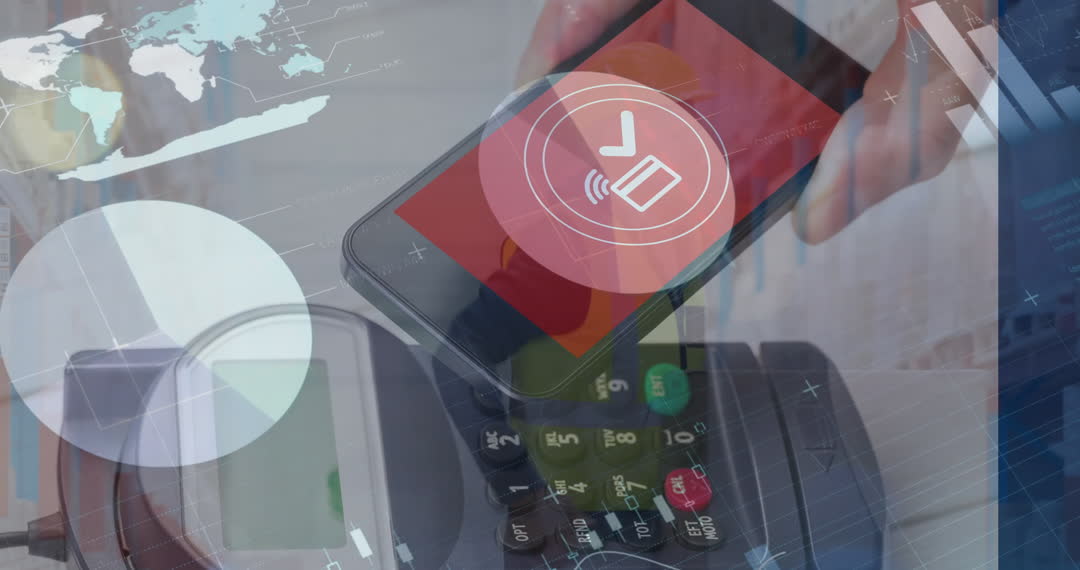 Close-up illustrates a cashless transaction, with a smartphone using NFC technology near a Point of Sale (POS) terminal. Overlaid with transparencies of global business graphics and abstract a digital mapping which communicates modern banking trends and global technological integration. Well-suited for content involving technology, innovative finance systems, modern shopping solutions, or market studies in digital lifestyle enhancements.