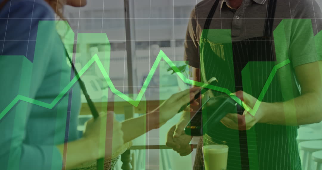 Shows customer making digital payment with smartphone amidst financial data visualization. Concept useful for illustrating modern technology in retail, impact of FinTech on transactions, customer convenience, and economic trends. Ideal for use in articles or presentations on finance, retail innovations, and technology advancements.