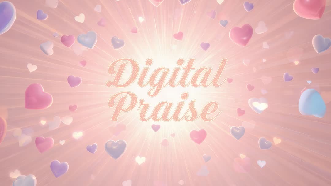 AI Generated Image. Featuring pulsing centered Digital Praise logotype, radiating soft pink rays and pulling floating pastel hearts forward. Glittering gold typography adding elegant sparkle and retro glam. Soft bokeh highlights and subtle lens flare enriching depth and motion. Loopable animated clip working well for social media opener, worship service intro, music video bumper, romantic campaign, product branding, event promo. Easily editable for replacing text, adjusting color palette, slowing or speeding animation, adding custom audio or logo overlay. Suitable for 4K projects, title sequences, livestream overlays, YouTube intros, slideshow transitions, seasonal content such as Valentine or anniversary promotions.