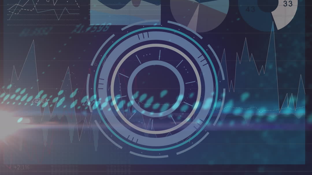 Abstract display featuring animated scope scanning over digital data and graphs. Implying concepts of cybersecurity, data analysis, or hi-tech innovation. Suitable for presentations, tech blogs, or educational content about digital interfaces and data visualization.