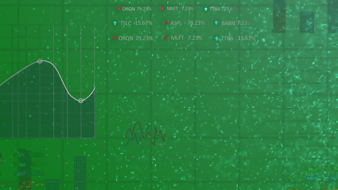 Representation of digital processing with snow and fluctuating data on a green background. Perfect for technology, finance, and data analysis themes, conveying a fusion of tech with nature. Useful for presentations, educational materials, or design projects illustrating digital innovations or financial forecasts.