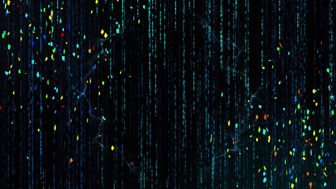 This vibrant animation features streams of digital rain interspersed with colorful confetti on a dark background, creating a lively and modern celebration atmosphere. Ideal for use in technology presentations, festive events, and multimedia projects. Enhances visual appeal where vibrant and high-energy mood is desired.