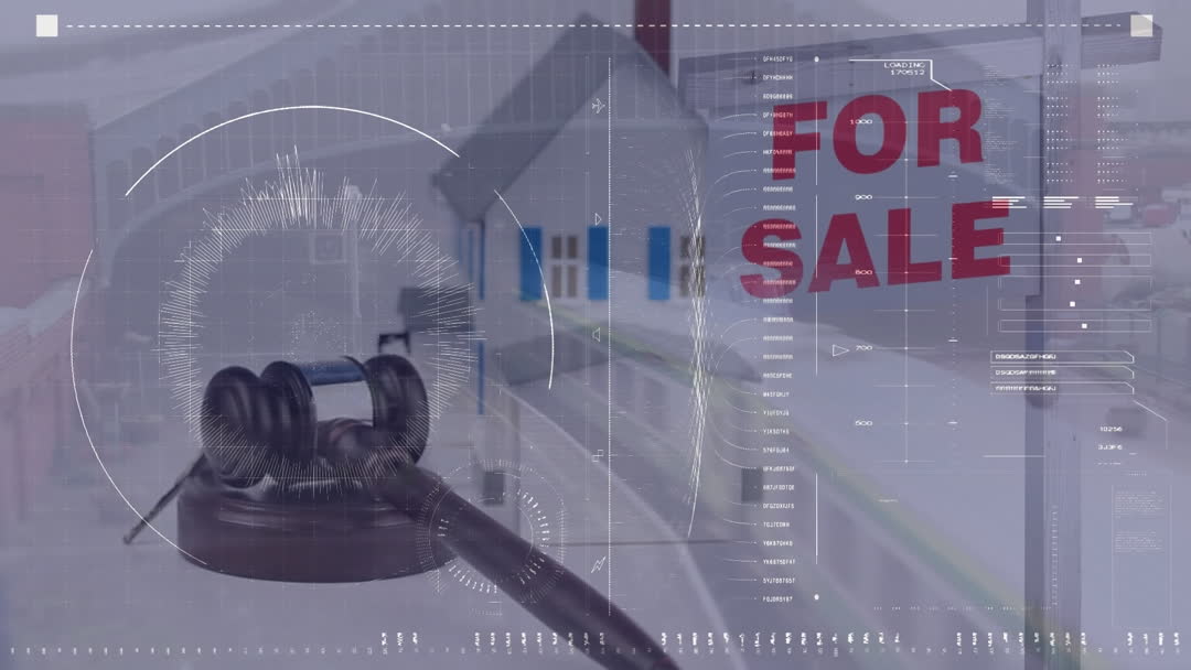 This conceptual design blends the elements of a digital interface with real estate symbols like a For Sale sign and auction gavel. Its futuristic design with overlay graphics and business data suggests high-tech solutions in property markets. It is ideal for use in presentations, digital marketing for real estate, discussions about technology integration in property sales, or advertising tech-facilitated home auctions.