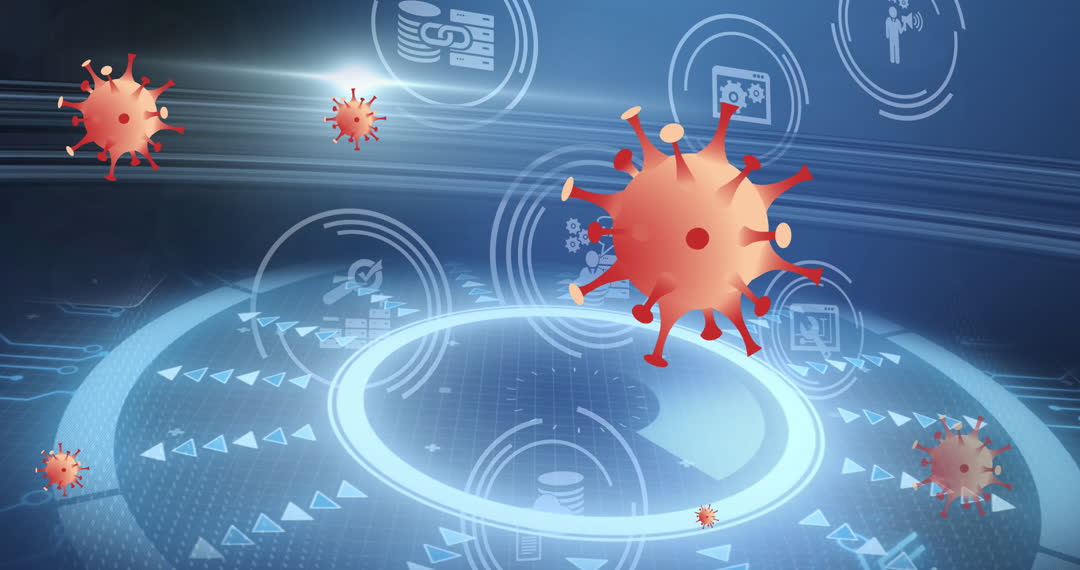 Digital visualization portrays COVID-19 cells interspersed with futuristic data processing elements, symbolizing the global impact of the pandemic on science and technology. The animated scene conveys a theme of biological research and health informatics. Useful for educational content, online courses, and articles focusing on intersecting fields of healthcare and information technology.