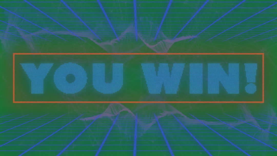 This graphic presents the congratulatory text ‘You Win’ against a vibrant digital backdrop, perfect for depicting success or achievement themes in media related to video games or digital content creation. Its retro, futuristic style can enhance creative materials such as game interfaces, social media posts, educational videos, or promotional content for events.