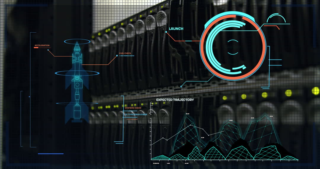 Futuristic digital visualization illustrating rocket launch systems and data processing overlaid on videos of server hardware, representing modern technology and innovation. Suitable for materials on space exploration technology, IT infrastructure, or high-tech digital interfaces, demonstrating advanced data monitoring and global connectivity.