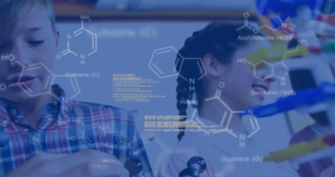 Diverse students exploring science concepts with an overlay of chemical formulas and digital data. Ideal for themes related to STEM education, innovation in teaching methods, or educational content for young scientists. This visual can be effectively used in educational campaigns, technology in education backgrounds, or promoting inclusive learning environments.