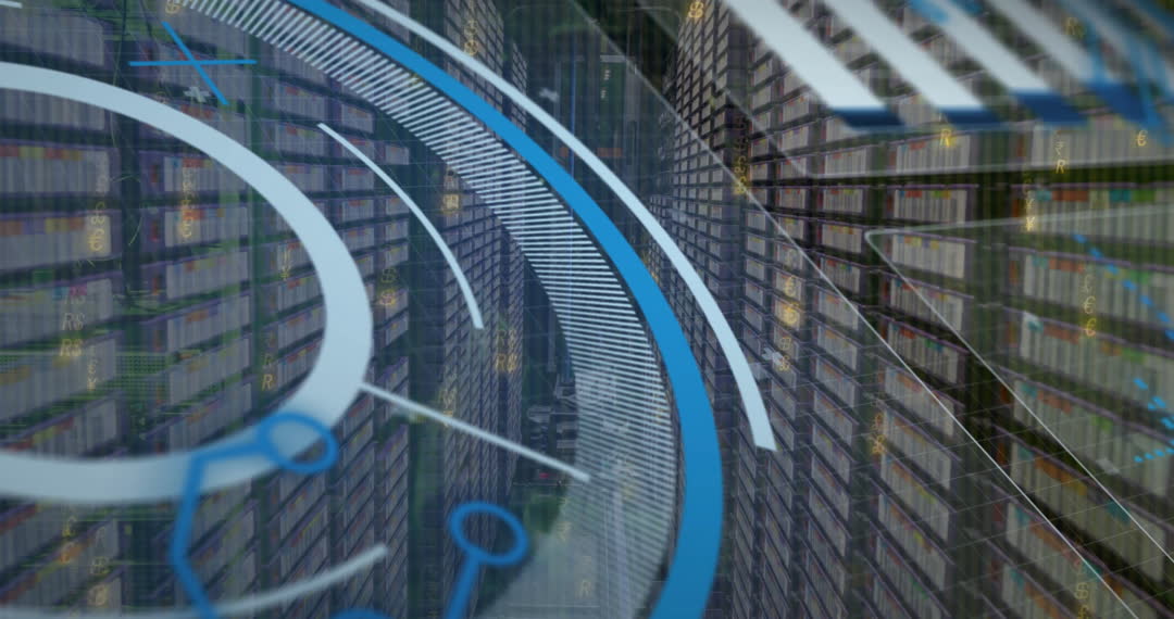 Abstract digital animation featuring scope-like graphics projecting over server racks. Ideal for illustrating concepts of data processing, advanced technology, communication networks, or digital transformation in presentations, marketing materials, and educational content. Highlights modern data solutions and technological advancements.