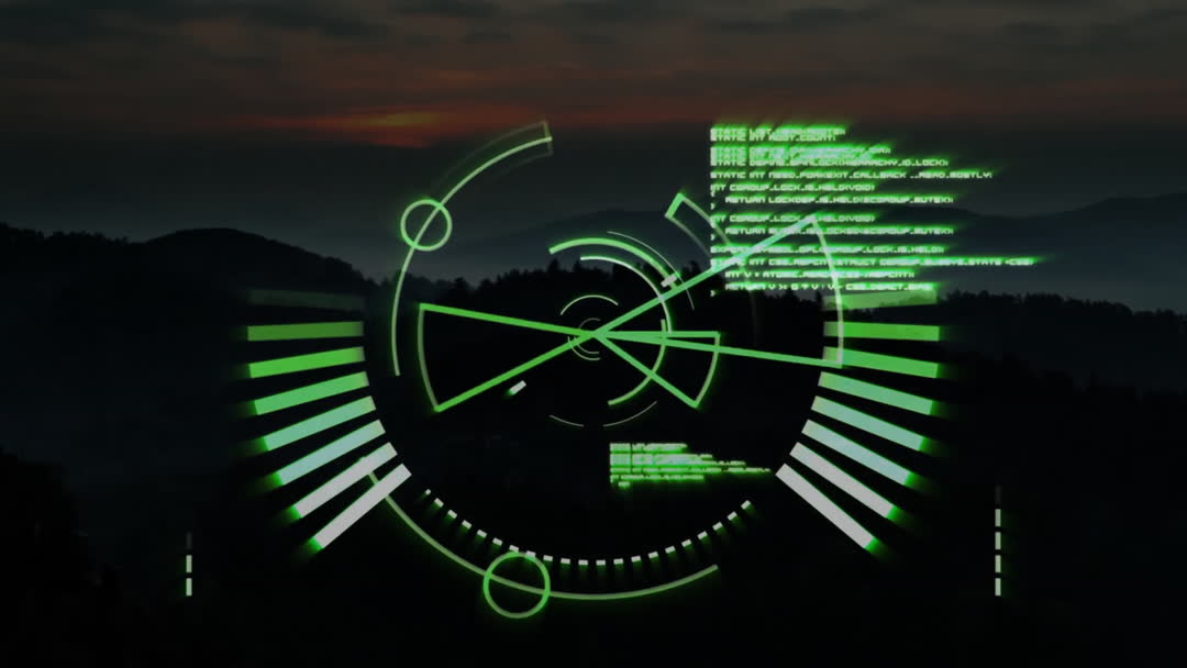 Animated digital scope overlay with data indicators processing over a natural landscape. The futuristic display creates a cyber-technology aesthetic. Useful for illustrating technological advancements, global finance visualization, virtual tracking or computing processes in presentations.