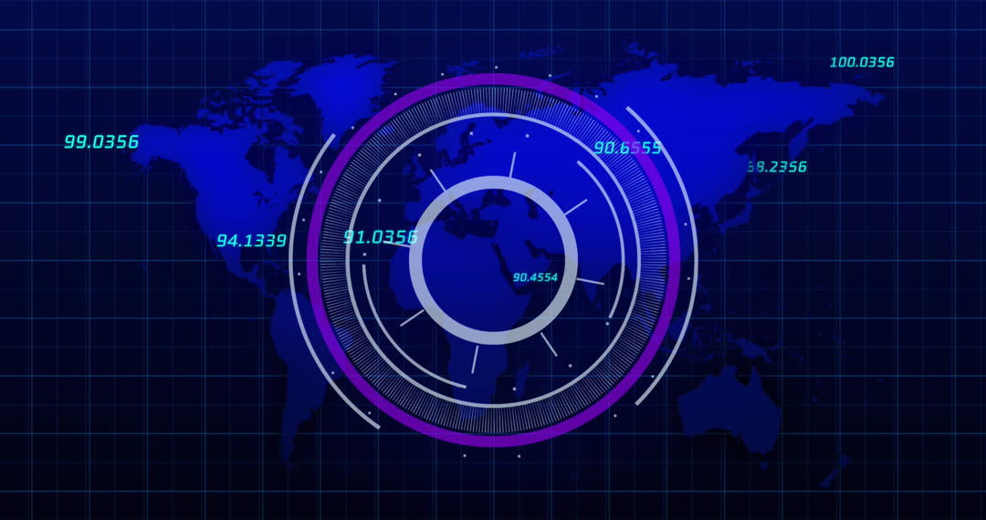 Digital scope overlay superimposed on world map shows dynamic numbers, representing data processing and financial analysis technology. Suitable for illustrating technological or financial editorial content in articles, presentations, and digital repositories.