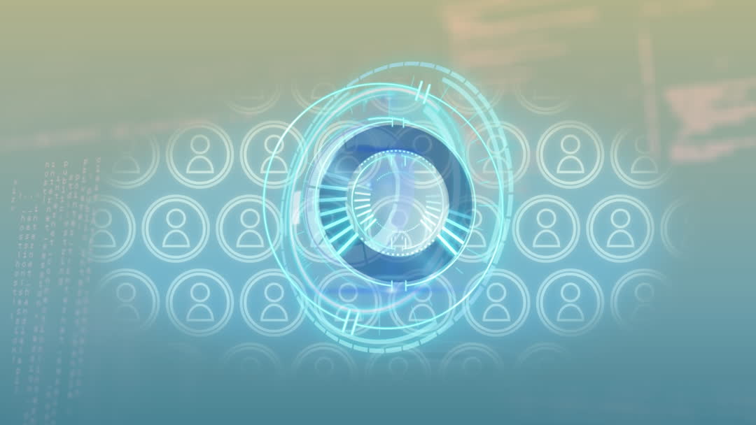 A digital scope continually scans over a backdrop of programming data and shifting profile icons, suggesting processes of data analysis, technology development, and cybersecurity. Such an illustration is effective when used in blogs or presentations about digital networking, software development, cyber innovations, or Big Data management.