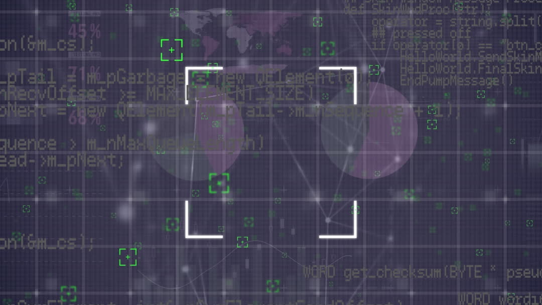 Animation shows digital scope overlaid on virtual network with programming code, indicating data analysis. Useful for presentations on cybersecurity, data processing technologies, or digital innovation themes.