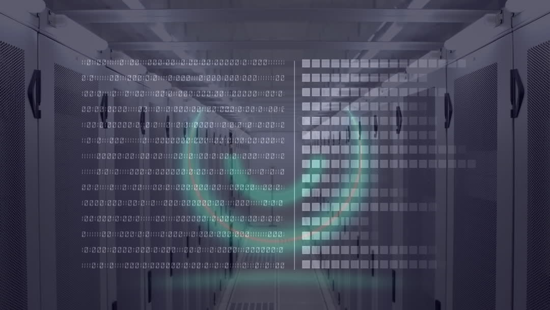 Visualizes concept of data processing and cybersecurity with a digital scope overlaying a row of computer servers. The animation of scanning motion combined with numeric binary code suggests inspection, analysis, and security in technological environments. Useful for illustrating topics in IT industries, showcasing data management, or enhancing content related to digital infrastructure and cybersecurity concepts.