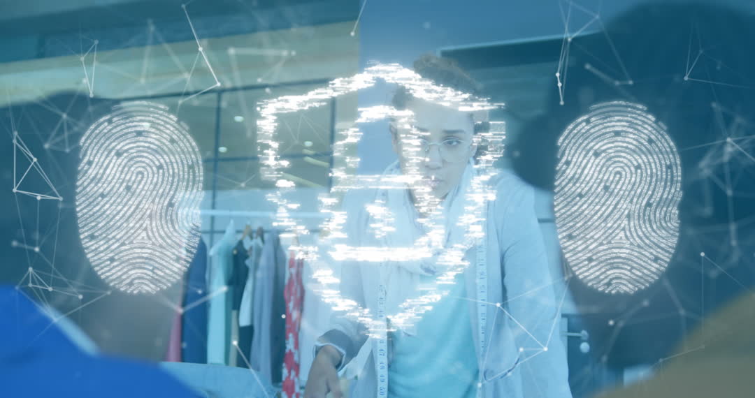 Diverse business team collaborates in modern office setting with animated padlock and fingerprint overlay, representing digital security innovation. Great for illustrating cybersecurity themes, technology in business, and team collaboration on future solutions.