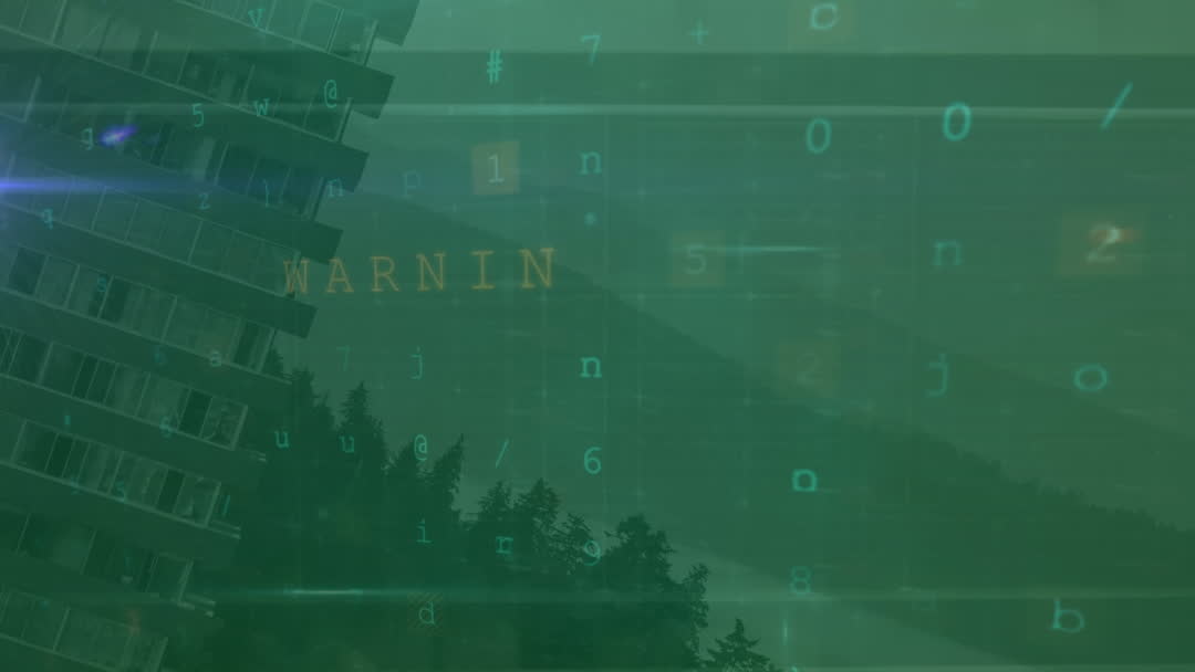 Visual depiction demonstrating the concept of digital security and malware threats, set against a backdrop of abstract buildings. Useful for illustrating cybersecurity topics, technology impact videos, and business safety presentations.