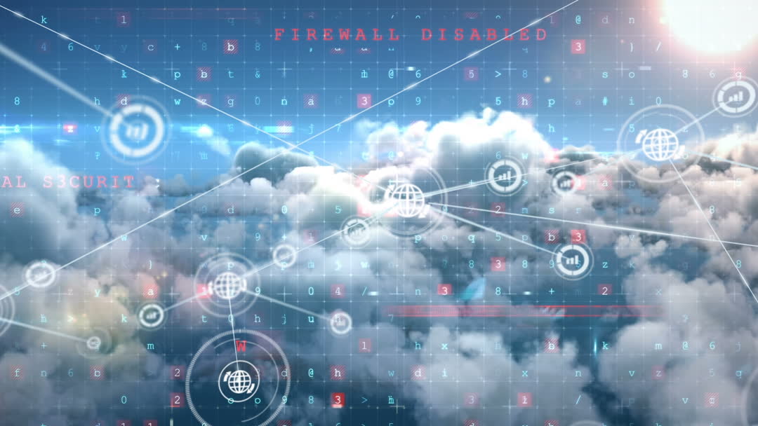 Depiction of a virtual network map with various global communication icons and 'firewall disabled' warning, layered over a sky with clouds. Symbolizes cybersecurity challenges and vulnerabilities in cloud computing environments. Useful for articles on digital threats, global communication networks, cybersecurity awareness exercises, and data protection discussions.