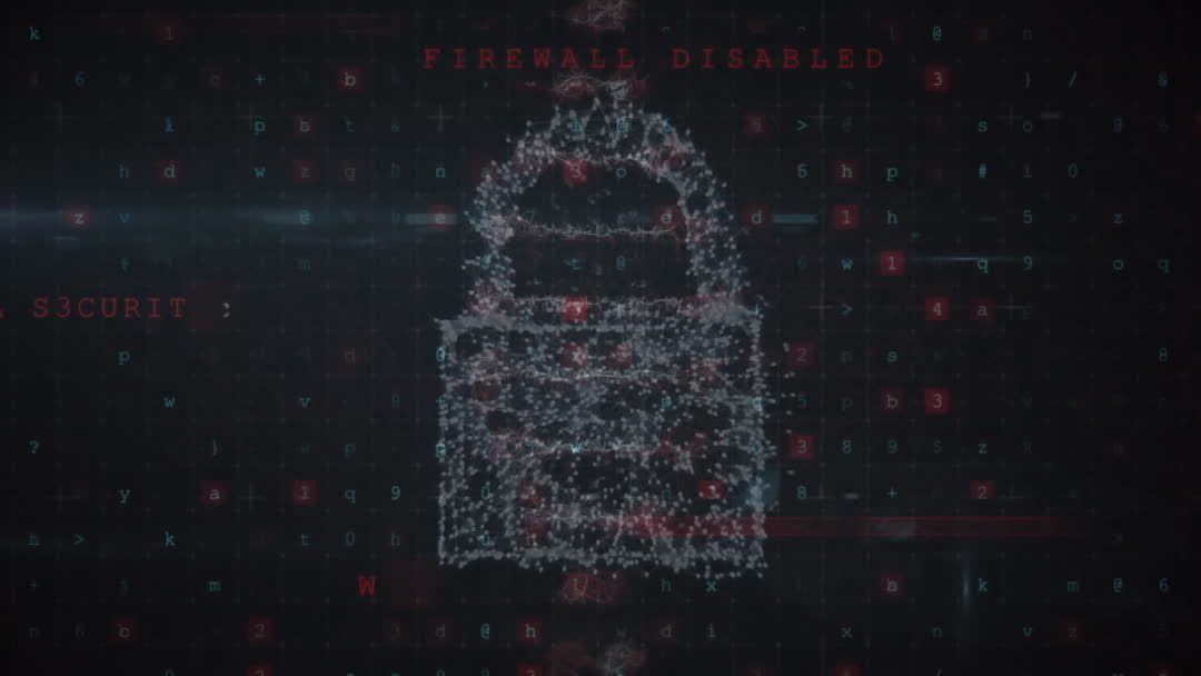 Abstract animation depicting digital padlock made of binary code. Red text 'FIREWALL DISABLED' suggests compromised security systems. Ideal for presentations on cybersecurity threats, online protection strategies, or illustrating concepts in tech blogs.