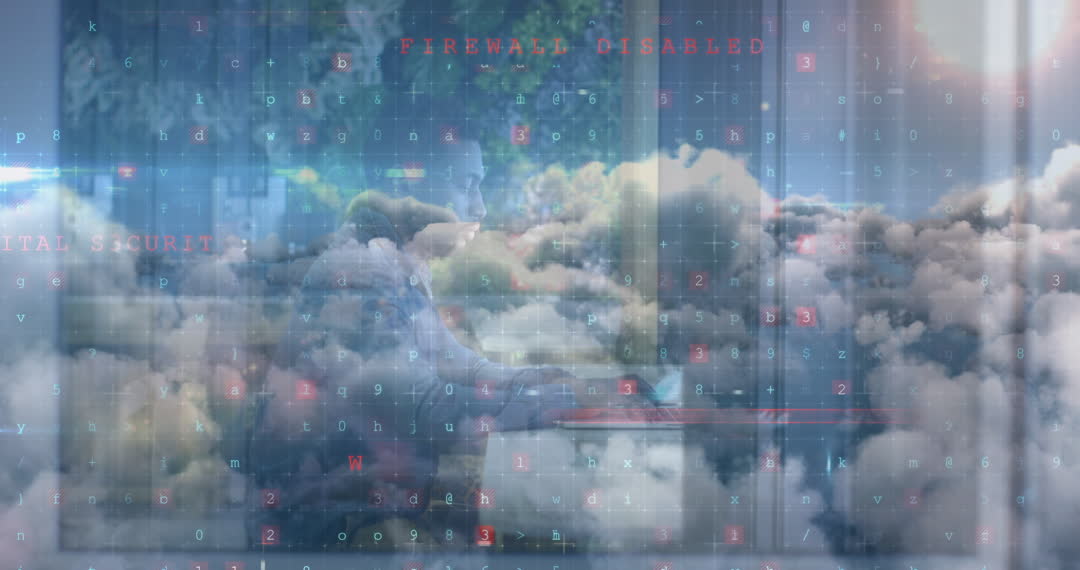 Abstract visual represents cybersecurity concerns with layers of digital numbers and a 'Firewall Disabled' warning superimposed over fluffy clouds and a businessman using a computer. Ideal for marketing campaigns, articles on information security, presentations about data protection or reports on technology trends showcasing online transparency and vulnerability issues.