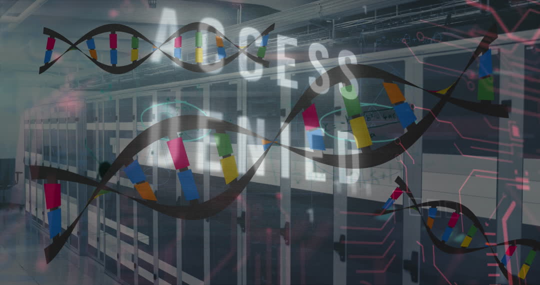 Image visualizes digital security concerns combining biological and technological themes with DNA strand overlay on digital components. Useful for educational materials on cybersecurity, tech blogs on hybrid technology concepts, or promotional content focused on innovation and technology solutions.