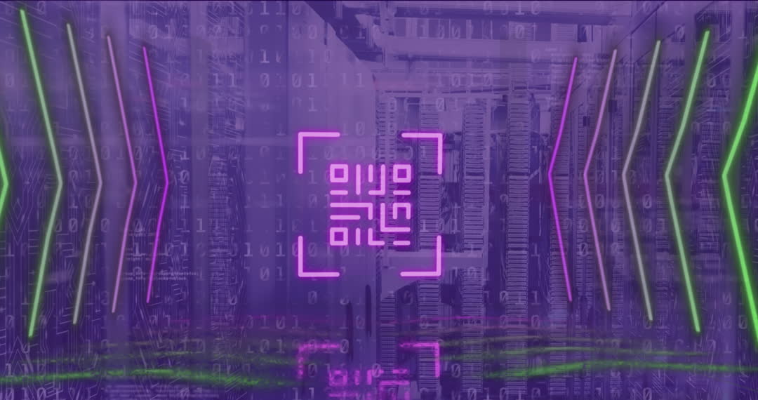 This abstract illustration showcases digital security with a QR code overlay and server room visuals. Binary code highlights concepts of data processing, cyber security, and digital interfaces. Ideal for use in articles, presentations, and websites focusing on technology futures or software development.