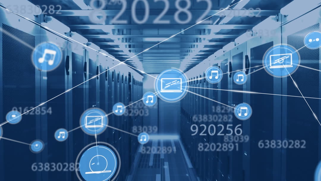 Visualization of interconnected digital icons overlaying server room videory. Ideal for use in presentations or websites focused on cybersecurity, cloud computing, digital storage solutions, or telecommunication sectors. Helps communicate concepts of global networking and data management.