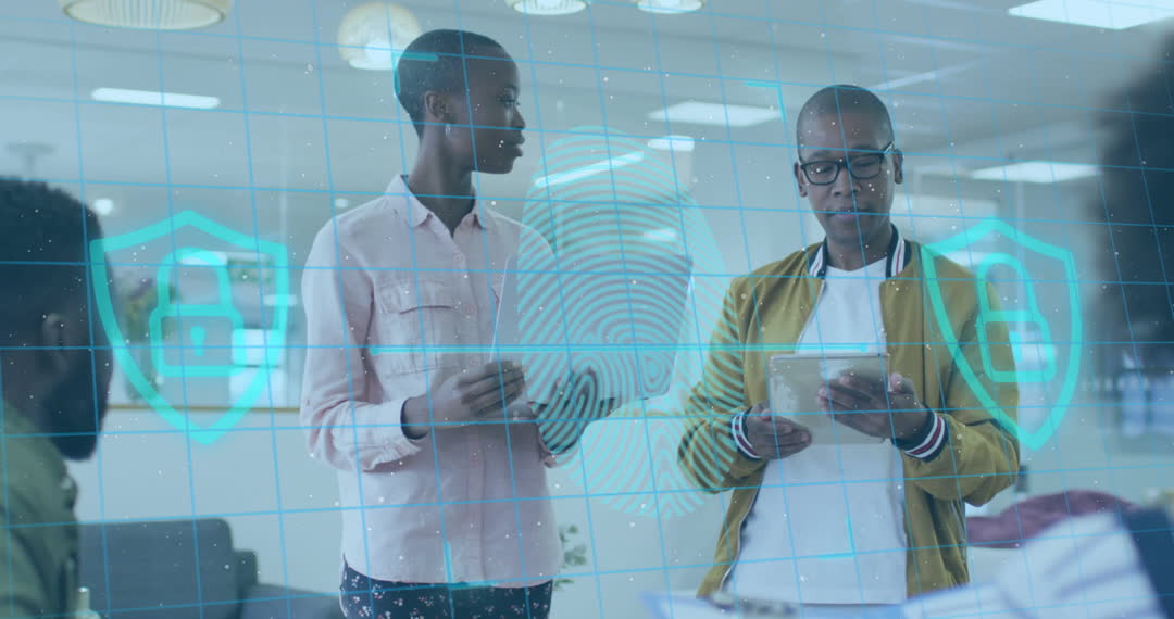 Visual representation of digital security with African American business professionals working with holographic fingerprint technology in a modern office. Ideal for illustrating concepts of cybersecurity, technology integration in business, and modern workplace environments in presentations, articles, or promotional materials related to corporate innovation and digital identity protection.