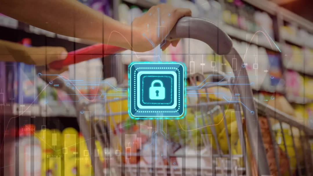 Animation showing a digital padlock as a symbol of cybersecurity overlaying a woman pushing a shopping trolley in a supermarket. Represents data protection in a retail context, connecting digital security with physical shopping experiences. Useful for illustrating commerce articles focusing on digital interactions at retail environments, or cybersecurity in consumer transactions.