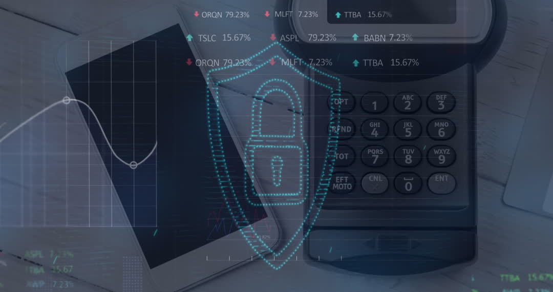 Security symbols and digital data are overlaid on a mobile phone and payment terminal interface, highlighting themes of digital security and data protection for transactions. Useful for content on cybersecurity initiatives, financial technology advancements, and illustrating secure online payment environments.