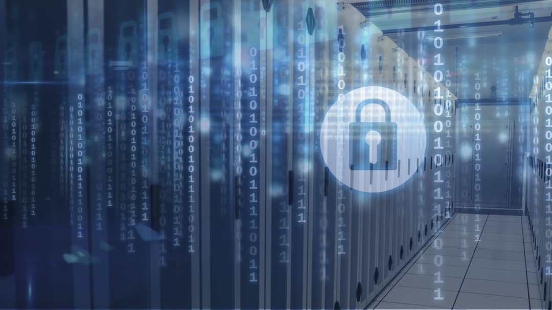 Representation of digital security with binary code and lock symbol overlaid on a server room. Ideal for illustrating concepts of cybersecurity, data protection, and information technology infrastructure. Useful for presentations, websites, and articles focused on technological advancements and digital network security.
