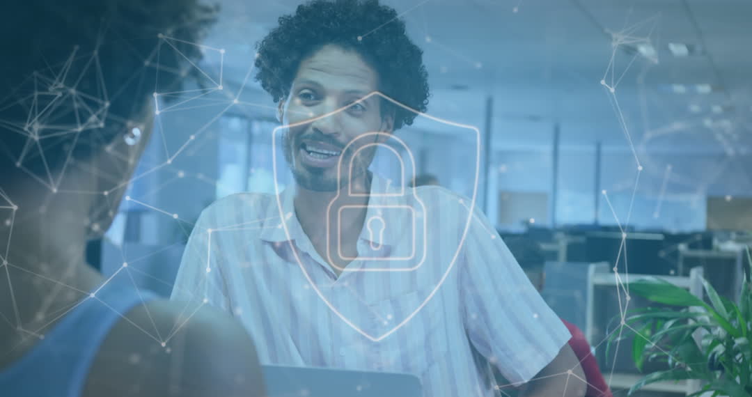 Ideal for showcasing modern cybersecurity solutions in a collaborative, diverse office environment. Useful for illustrating technological advances in digital security and innovation in workplace settings.