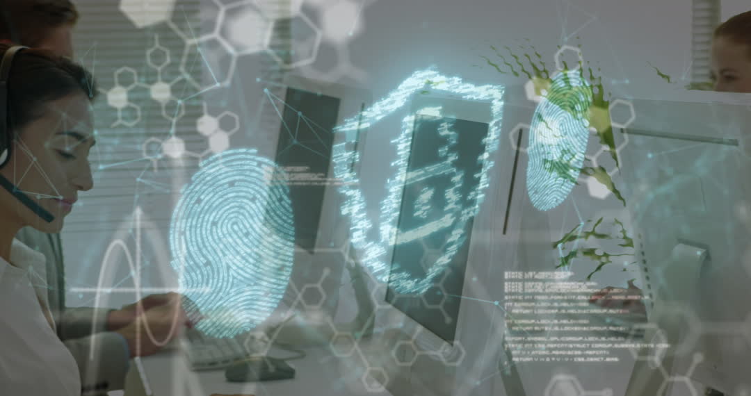 Visual combines business people with holographic security elements like a padlock and fingerprint. Representation of cybersecurity concepts and digital protection in business environments, suitable for illustrating articles about technology, data security, and digital workforce systems.