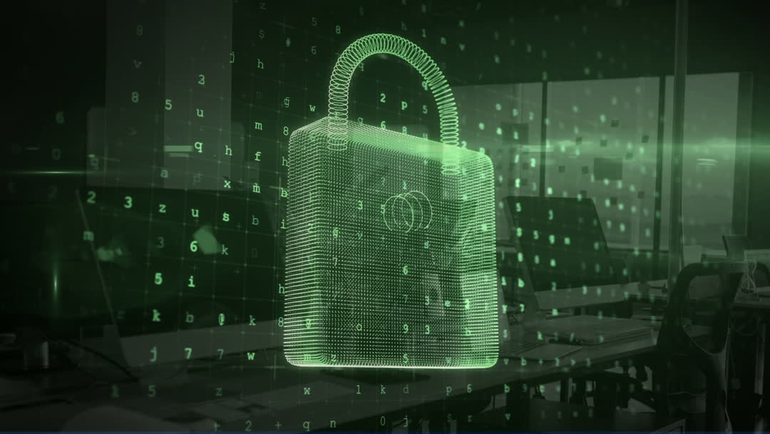Conceptual videory of a holographic digital padlock in an office environment. This visual emphasizes themes of cybersecurity, data protection, and digital privacy. Useful for illustrating articles or presentations about internet safety, corporate data security strategies, or showcasing advanced technology in business settings.