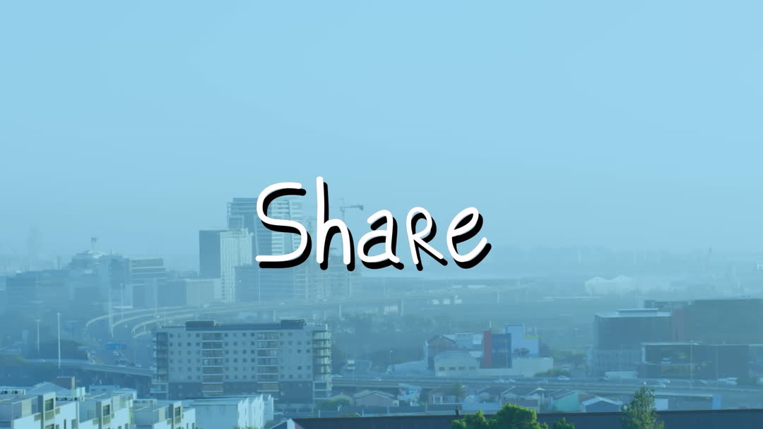 Animation displays 'Share' in bold font against a modern-day cityscape, symbolizing connectivity. This can be used in business presentations, promotional videos, or content relating to global finance and innovation.