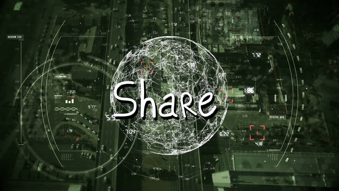 A concept illustration featuring a globe visualization symbolizing digital and global connections over a blurred cityscape background. The animated 'Share' text highlights themes of technology and communication networks. Useful for content related to digital transformation, global business initiatives, social media networking, and technology-driven collaboration.
