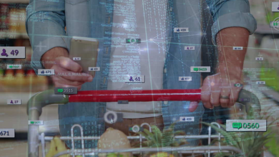 Middle-aged white man using smartphone in grocery store with digital network theme highlighting connectivity between technology and shopping. Data and social media symbols represent combination of physical shopping with virtual engagement. Useful for content about tech-enhanced shopping experiences, future of retail, or e-commerce blogs.