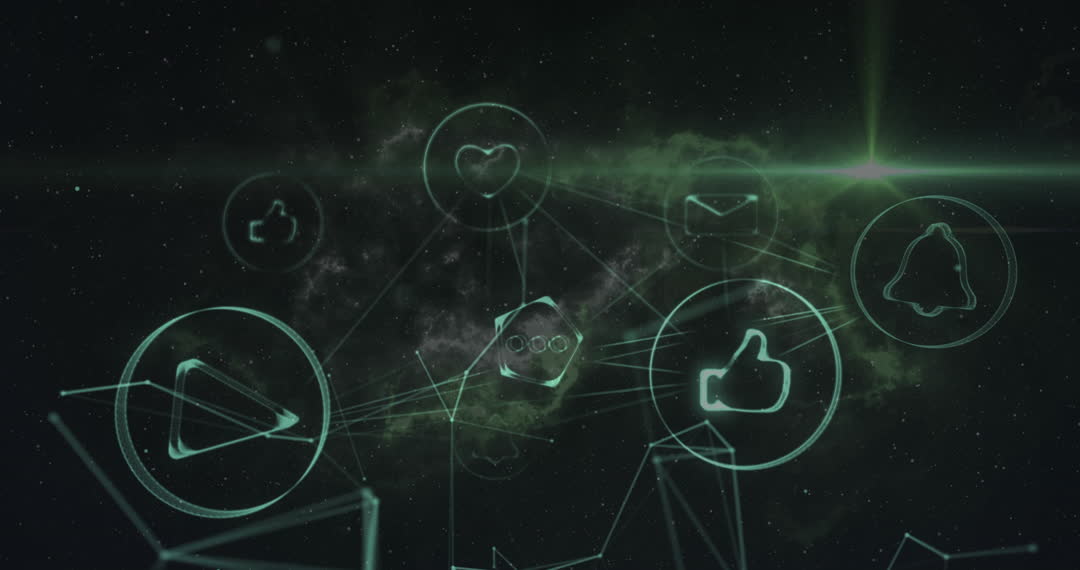 Abstract representation of digital social connections, showing networking icons over a galactic-themed background. Useful for illustrating concepts related to online communication, digital marketing, or the interconnected nature of social media platforms.
