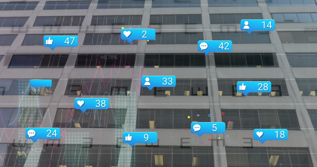 This composition creatively integrates social media notifications with a city skyscraper, highlighting the intersection of technology and modern urban life. Useful for illustrating concepts involving Internet connectivity, digital communication, social networking strategies, or modern lifestyles influenced by technology.