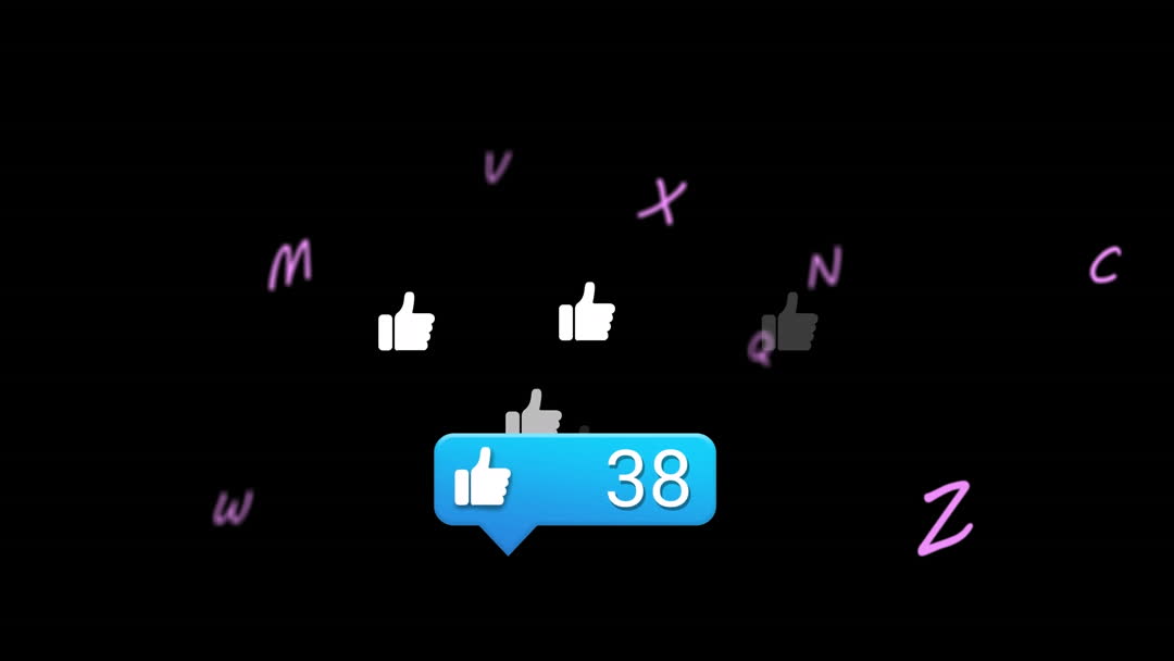Dynamic scene showing social media like icons with a notification count set against floating letters on a black backdrop. Ideal for use in digital marketing projects, illustrating social media engagement, presentations on virtual communication, or teaching tools related to the impact of digital interfaces.