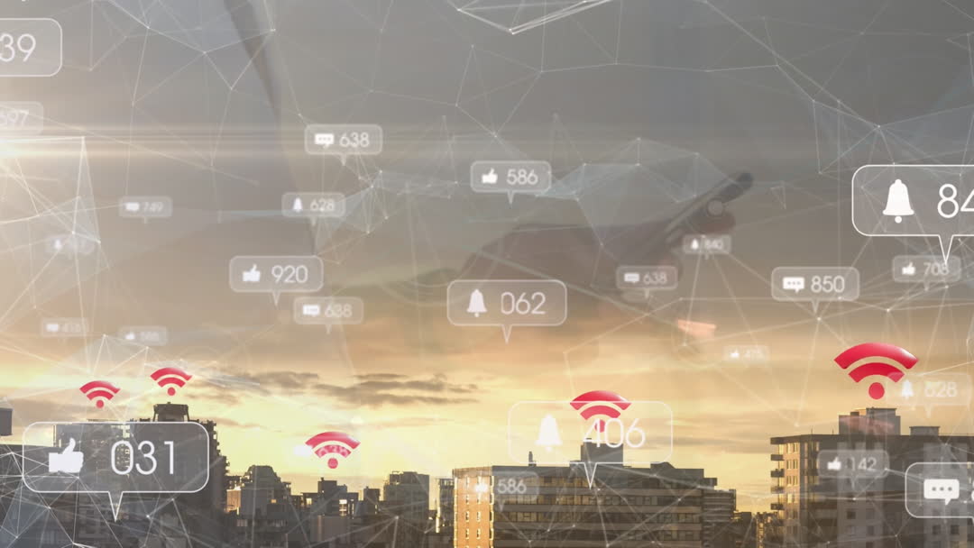 A modern city skyline is overlaid with digital social media icons such as notifications and wifi connectivity signs, representing the integration of technology and urban life. Useful for illustrating themes of digital communication, connectivity in urban environments, or advancements in social technologies.