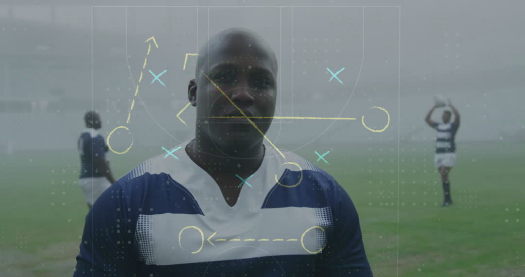 Digital visualization blends with rugby teamwork concept, showcasing sports strategies on field. Suitable for educational content on game tactics, promotional materials for sports analytics, or inspiration for team coordination and fitness goal presentations.