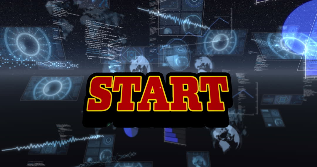 Futuristic digital start screen featuring animated text elements and complex data visuals, perfect for illustrating technological advancements, software development, or virtual reality experiences. Ideal for digital presentations, tech blogs, or educational resources focusing on innovation and data sciences.